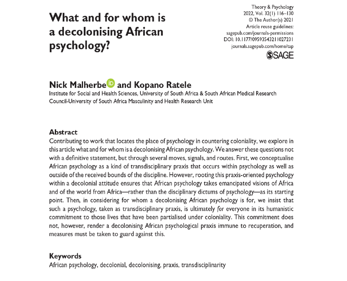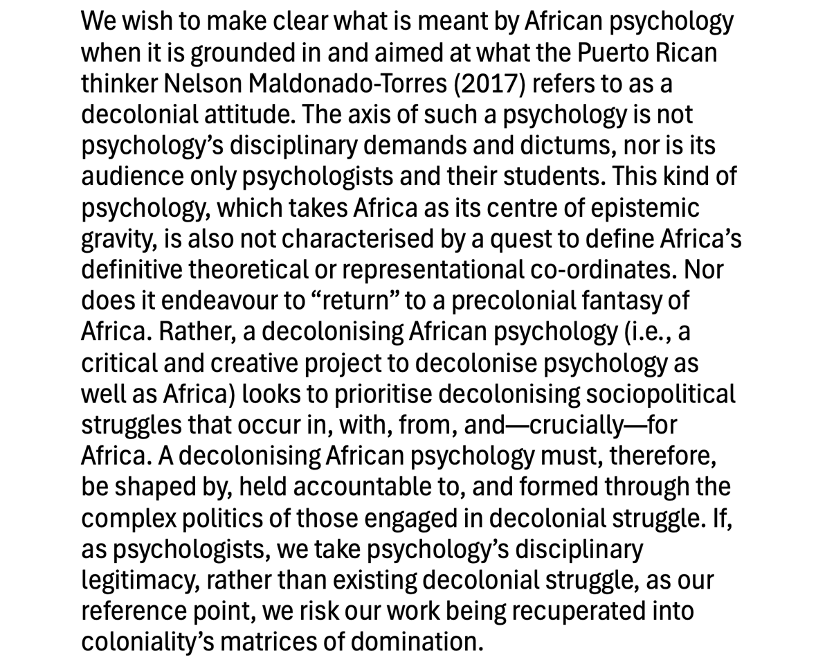 I mentioned the colonial. There is a non-incidental connection between decolonial thought and the way I think of African psychology. Along with the decolonial collective I work with, and former students and others colleagues, I have sought to make this as clear I can.