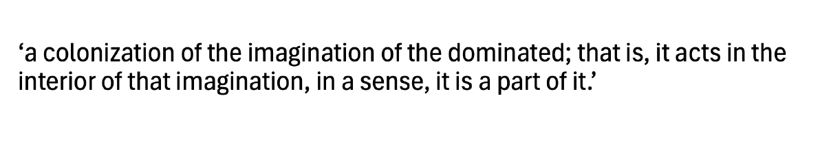 ‘in spite of the fact that political colonialism has been eliminated, the relationship between the European – also called ‘Western’ – culture, and the others, continues to be one of colonial domination. It is not only a matter of the subordination of the other cultures to the European, in an external relation; we have also to do with a colonization of the other cultures, albeit in differing intensities and depths. This relationship consists, in the first place, of a colonization of the imagination of the dominated; that is, it acts in the interior of that imagination, in a sense, it is a part of it.’[1]Quijano, Aníbal (2007). Coloniality and modernity/rationality. Cultural Studies, 21 (2) 168 – 178