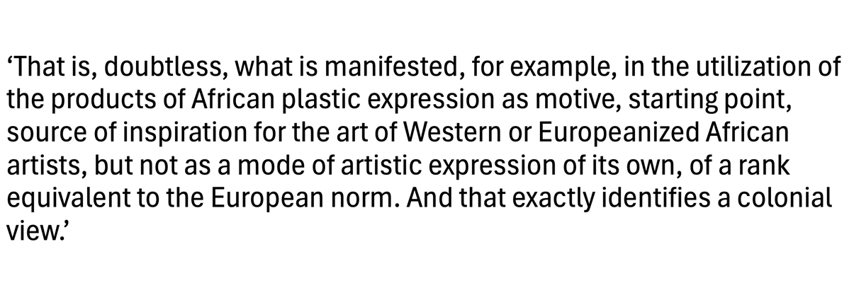 As Quijano writes, ‘what the Europeans did was to deprive Africans of legitimacy and recognition in the global cultural order dominated by European patterns. The former was confined to the category of the ‘exotic’. That is, doubtless, what is manifested, for example, in the utilization of the products of African plastic expression as motive, starting point, source of inspiration for the art of Western or Europeanized African artists, but not as a mode of artistic expression of its own, of a rank equivalent to the European norm. And that exactly identifies a colonial view.’
