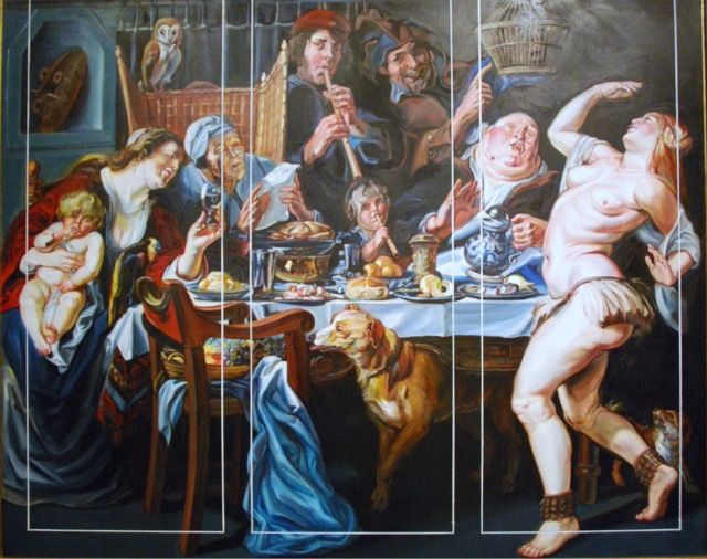 In my reading, Phokela turns the world of Europe and Africa, white and black, as well as the word of art itself, inside out. He displaces the white artist’s gaze with his own way of seeing. But not in a simple way. He looks at the same object or events that the white artists saw or sees, and throws the European artist out, and yet you cannot read him as simply an African artist mimicking the Europeans. I think what he does is to show how to see both from heres (plural: the many places from which he learns to look) and elsewheres (being wherever he travels and learn from). He is not merely saying, ‘see, I too can do this shit if I want to’. He is also not saying to me, as I stand in front of his work, ‘I, a black artist, made this work; respect the black messiah’. He is saying, to the art world, in spite of European art history which for a long time banished the African artist to the margins of the art world, ghettoising him, ‘I am nothing but an artist’. And to me he says, I feel, ‘you may experience unsteadiness to suddenly be transported to the status of a god, but shouldn’t you experience the world from above just as you have done from below, from there as well as from here.’ What I came to understand is, then, that whatever is human, however politically unsound, belongs to all of us. When I say, The world looks like this from here, I am saying ways of seeing are imbricated with places. However, there is no essential African way of apprehending the world. Here can be there, or over there, or anywhere from which look at the world and yourself.