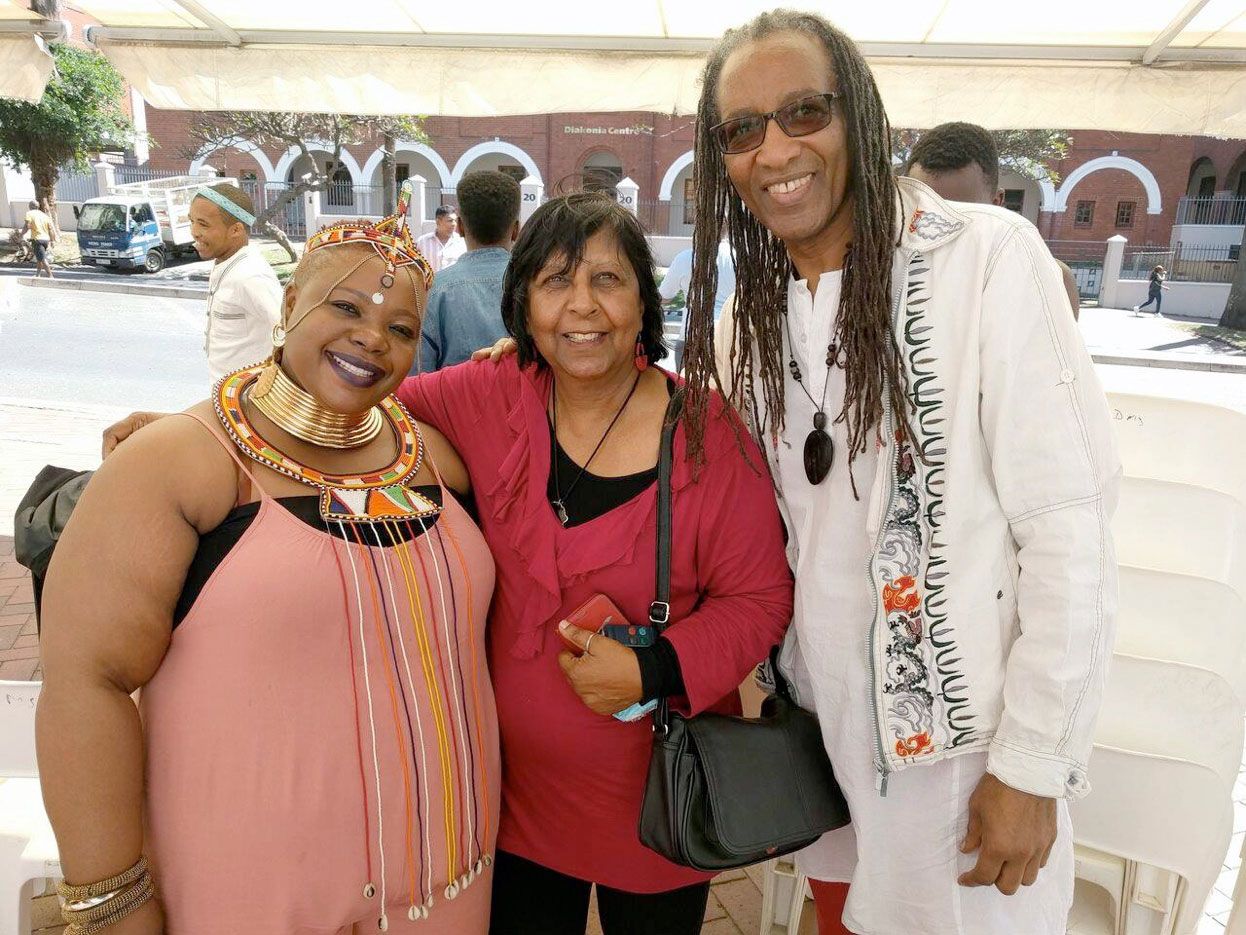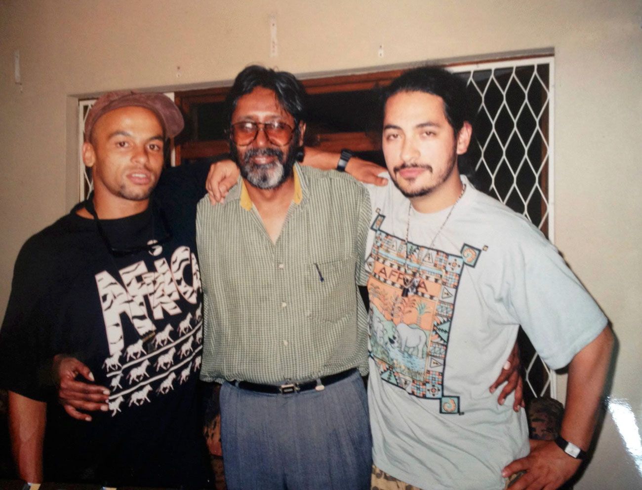 In this photo Ngoma team members Curtis Watt and Francisco Carrasco are embraced by the legendary Strini Moodley, my close comrade and associate of Steve Biko during the Black Consciousness days. We were honoured to be invited by Strini’s home to sample his delicious curry and partake of his incisive wit and intellectual rigour. We spent many hours in discussion with him to explore radical and innovative concepts of using cultural education as a tool for empowering the youth as truly enlightened leaders of the envisioned democratic South Africa.