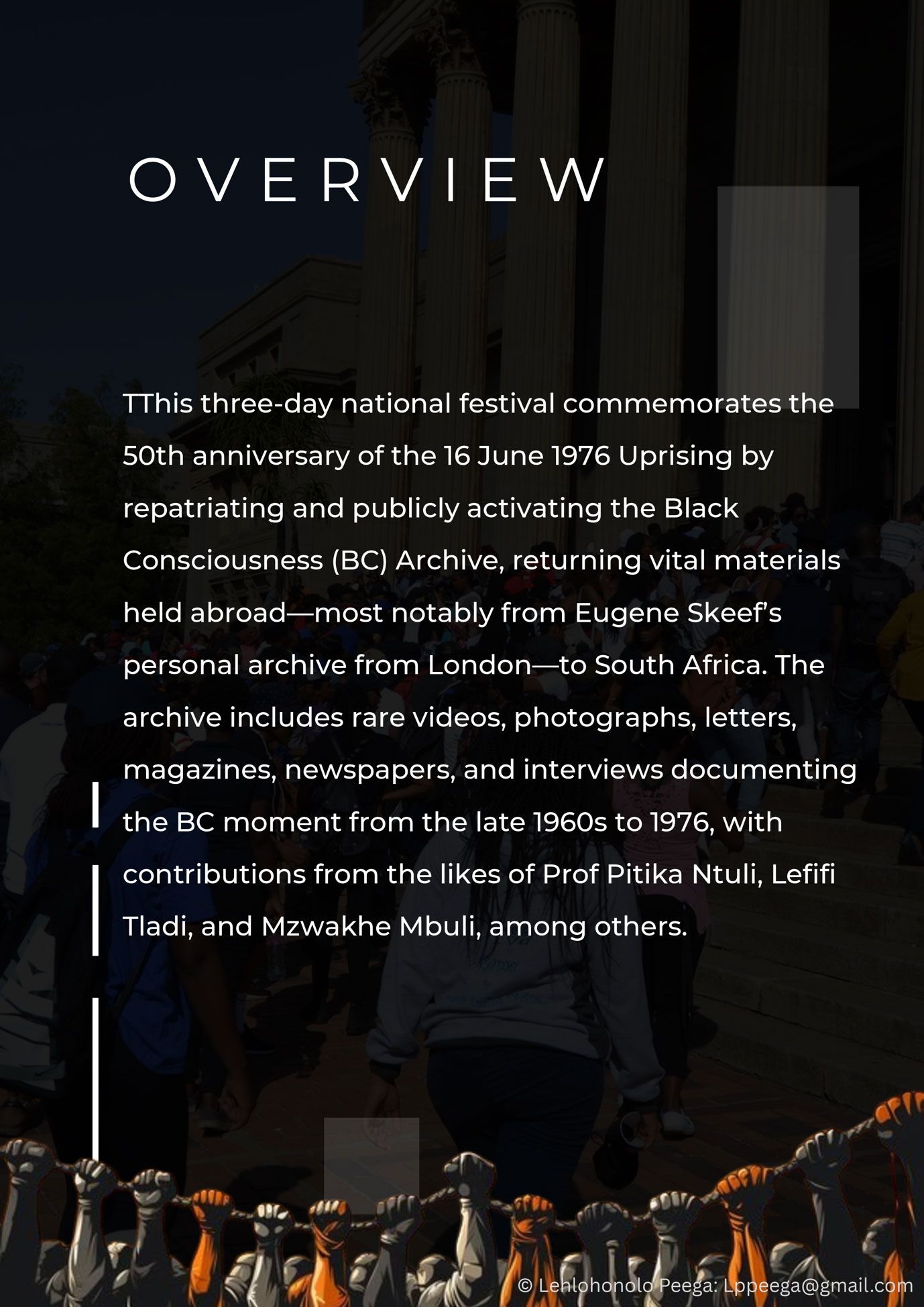 The ethos of African independence and decolonisation that inspired these festivals is at the root of our celebration of the BCM as the principal engine that drives the commemoration of the Soweto Uprising. Together with these young visionaries, we are Ancient to the Future!