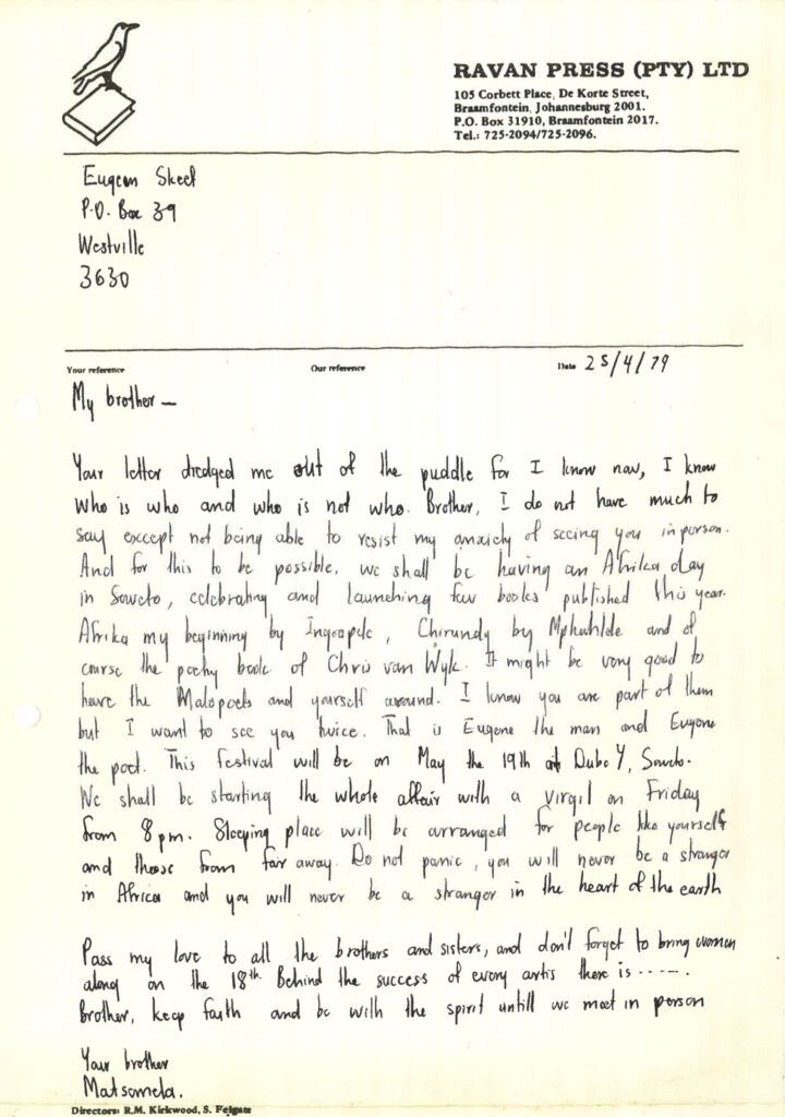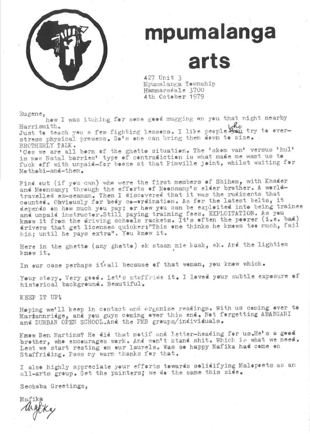This is a letter to me from the Radical BCM writer and activist Mafika Gwala written in 1979 around the time when I drove a group of Staffrider affiliated writers around the country to conduct writers’ workshops and perform poetry readings in the community. Mafika and I were both what we called back then ‘karatekas’ (karate exponents). We used to joke around a lot but were also known for our no-bullshit resources in tight situations. On the trip to Cape Town, I recall Mafika always wanting to sit next to me as the driver of the VW Kombi. We would have long conversations, regaling each other and the rest of the group with lavish stories of our escapades. He would sometimes fall asleep with a glass of whiskey in his hand, without even as much as a drop leaving the glass. I remember being particularly fascinated at how stable the glass would be when I drove along the bendy roads on the slopes of Table Mountain. But once I heard him snoring heavily, I knew that he was fast asleep. Then I would lean over to carefully remove the glass… and, I tell you, it was unbelievable how the brother would immediately tighten his grip and sit up straight and tell me to f**k off, before taking another swig, as if he’d been wide awake all the time.