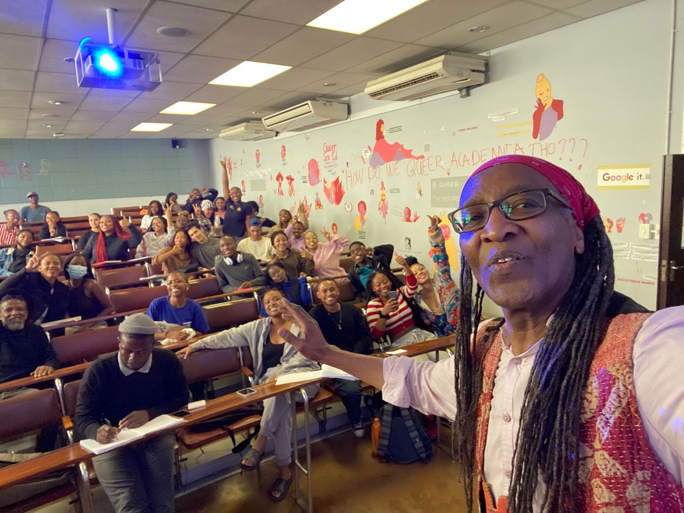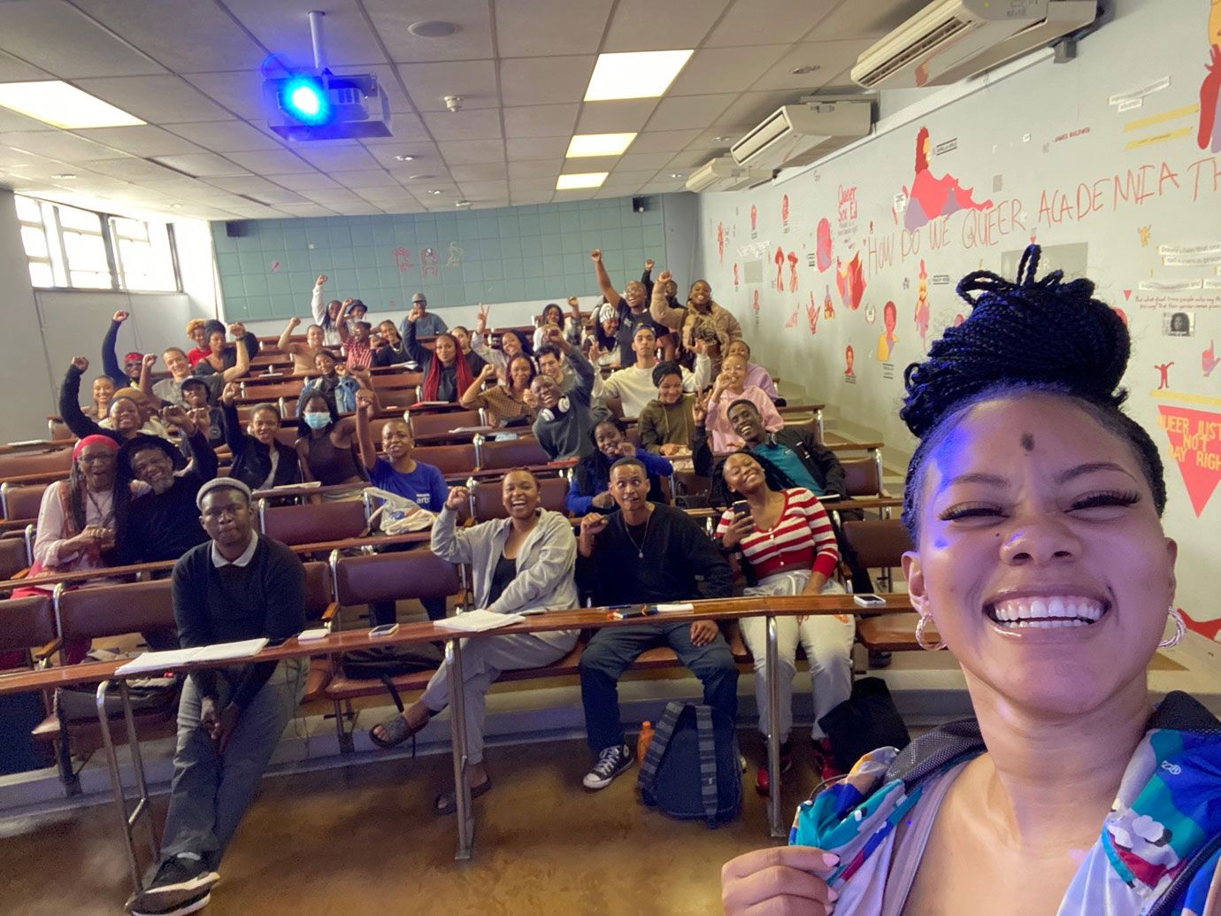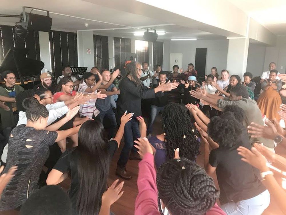 The chant “Who We! Simunye!” flowed straight from this as we clapped the beautiful energy back and forth to each other in every direction. I asked the musicians to return to their instruments and play to the groove we had arrived at. The students slowly danced to places they could find among the migrated chairs and enjoyed the music as each member of the band took a solo. We received a standing ovation! A few of them came up to thank me individually and said that they wished their lectures could be immediately decolonised and conducted in the manner they had just experienced. Simunye! We Are One!