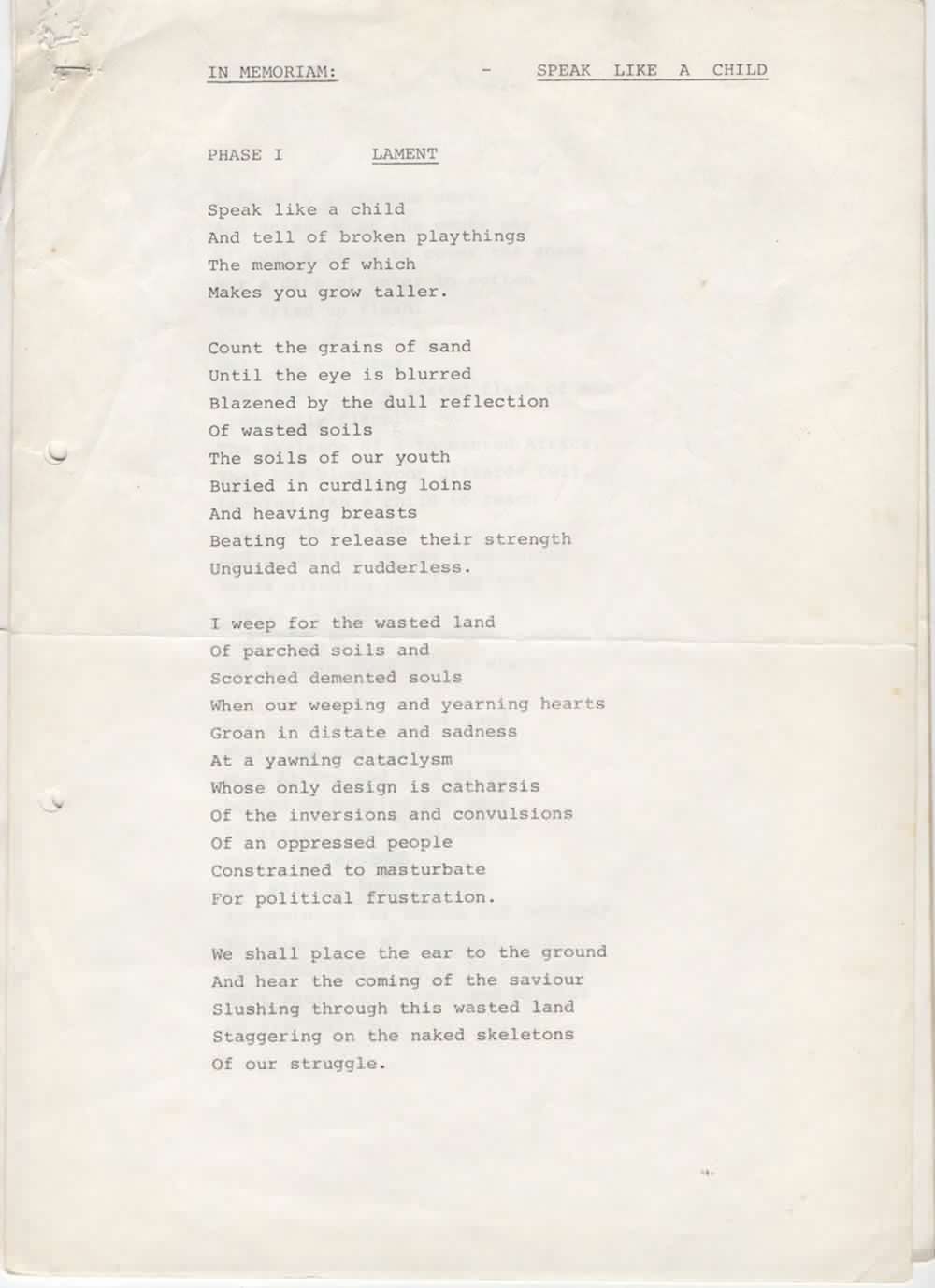 When Ben and I were developing the cultural group Malopoets, some members and I would sometimes sleep on the floor of Mafika and Pius’s offices. One day, knowing that Mbuli sometimes wrote poems as a private hobby, and that he was a fan of Malopoets, I encouraged him to write a poem so that he could read with us. In Memoriam: Speak Like A Child is the result of the inspiration that superseded his initial shyness. I helped him develop his performance skills; then Ben and I invited him to join Malopoets on stage in his first ever poetry performance.
