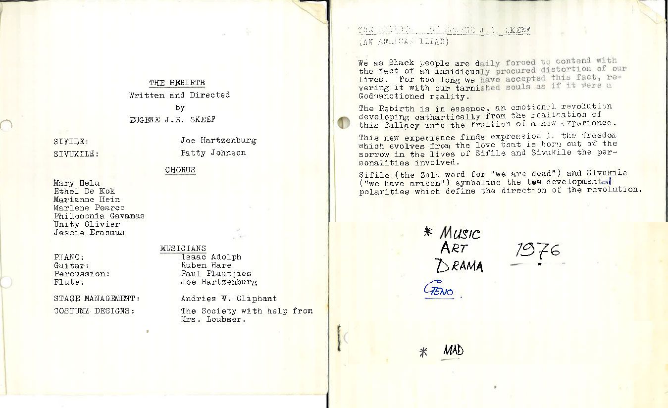 The Drama Society represented the cutting edge of the student movement, with members including Unity Olivier, Andries Oliphant, Joe Hartzenburg, Paul Plaatjies, Ziggy Adolph, Jessie Burgess, and Garnett Robert. Our group of campaigners included the legendary Ruben Hare, who would go on to become Deputy President of the South African Students’ Organisation (SASO), and the formidable activist Jean Swanson, who brought in the might of her family’s business chain to support our activism with much needed provisions for our sustenance.
