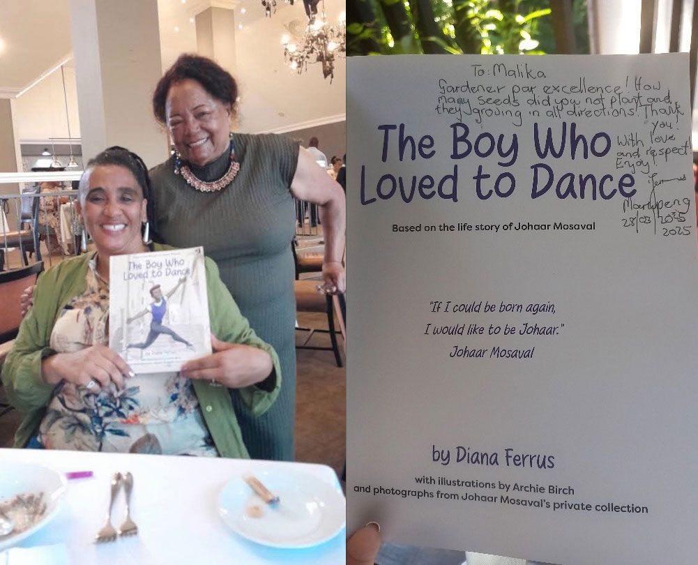 In March 2025, now exactly one year ago, so fresh in my mind – you and I together again on a different ‘mission’, this time on a long shuttle ride from OR Tambo to our accommodation near The Cradle of Humankind in Maropeng, where our annual NIHSS awards gig would take place. We chatted all the way, as we’d done before, enthusiastically sharing inspirational nuggets from the new South African fiction and poetry submissions we’d been tasked with adjudicating. Gaaning aan about our own works-in-progress, the pros and cons of working with editors – you proudly gifting me a copy of your freshly published children’s book The Boy Who Loved to Dance, based on the story of Johaar Mosaval.