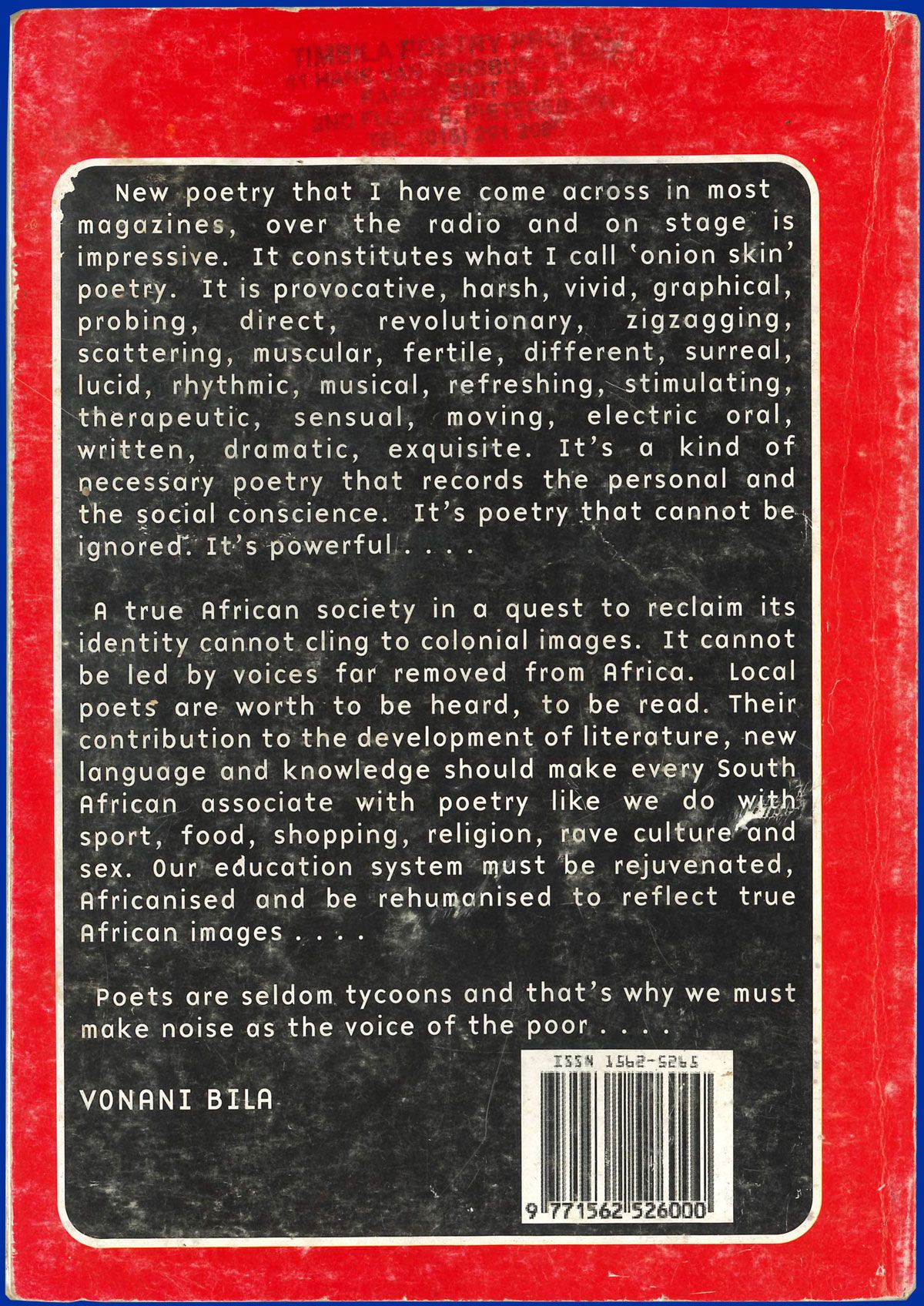 The Timbila Poetry Project was started in 1999 by the poet Vonani Bila. The preamble to the constitution of the project reads: