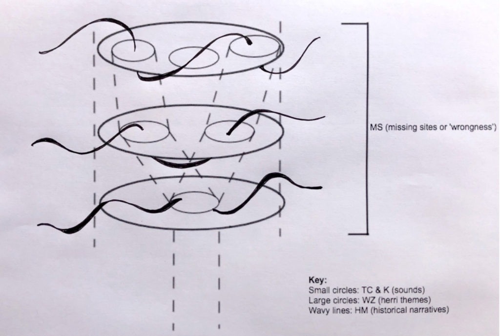 Situated in this way with regard to History – breaking from the subject/object determinant of music as a cultural practice and the attendant ways in which such culturally situated music is brought into the world through performance and reception – the herri composing machine produces broken music entangled with contemporaneity unlimited by the units of History, or rather, Music History. The directions encouraged by the apparatus of herri as composing machine could instantiate any number of unexpected multiplicities, points of encounter, significatory paths and unanticipated circulations with all histories, with all forms of life, with all manner of becomings. In this way the herri composing machine speaks to the species history of a time of impending ecological catastrophe and the irrelevance of History in the face of extinction.