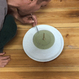 Now you place the charged spin-top on the middle of a ceramic plate in front of you: One hand around the handle of the launcher, the thumb at the top of the groove counterbalancing and keeping it centred. With the other hand gripped through the ring at the end of the string you begin pulling. Starting slowly but gradually building momentum and speed, you must keep the launcher-hand very steady, your arm muscles balancing the pull from the thread that is now augmented by growing centrifugal forces. The pull ends suddenly when the thread is all un-wound and in that moment your launcher-arm must immediately re-adjust to this change in order to keep the launcher as horizontal as possible. At that very moment, you lift your launcher-hand as swiftly and vertically as possible to release the spin-top.