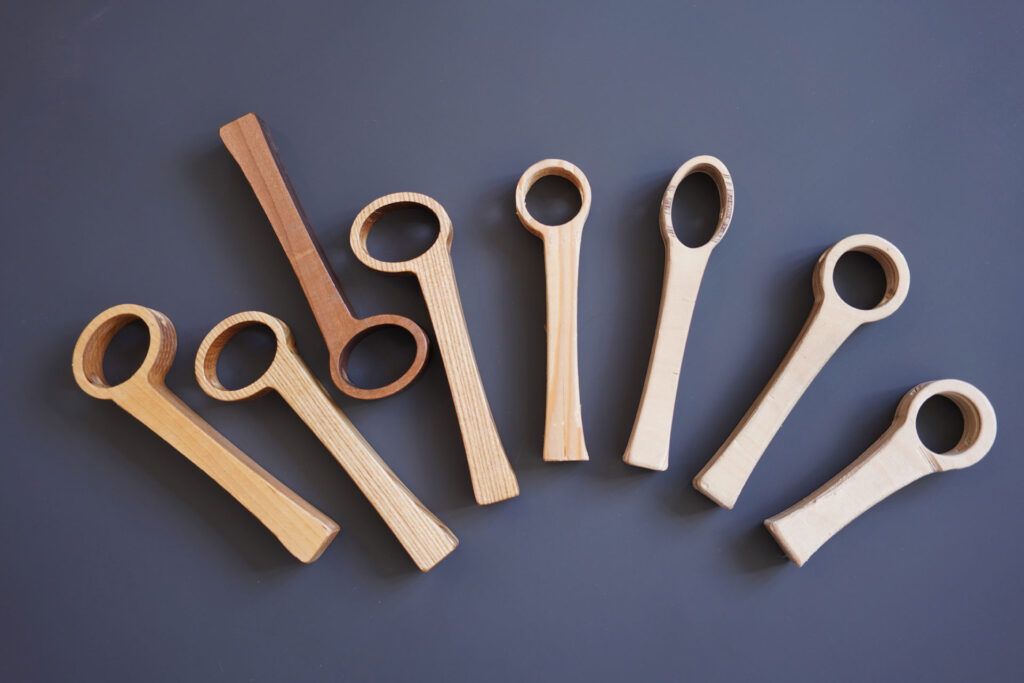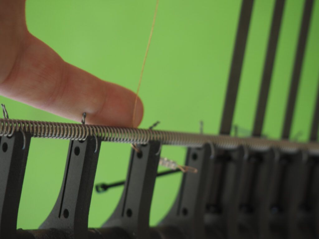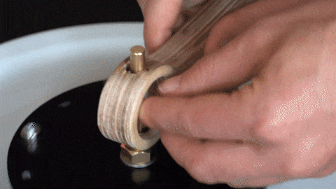 Playing a musical spin-top is a multifaceted thing. You take the custom-made wooden launcher with one hand and place the top’s central brass-pole through the launcher’s two holes. With your other hand you slide the fine, strong kite string through the hole in the spin-top’s pole. When enough thread has passed through the hole, so as not to be pulled out by the initial tilt, you start turning the pole with two fingers of your hand, weaving the thread around the pole. Your other forefinger and thumb guide the string while carefully keeping it tensed. You can control the shape of this ‘bob’, knowing that during the launch it will go through the exact same reverse course. When the thread is all wound up, the ring at its end reaches the main body of the launcher and is blocked by it.