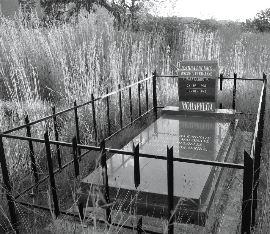 On the headstone is inscribed: ‘Joshua Pulumo Mohapeloa – Motsoali ea Khabane Robala ka Khotso’ [A parent who is honourable,[8]‘Khabane’ also means righteous, fine or virtuous. rest in peace]; and on the gravestone: ‘O Qapile Pina E Monate Motaung Oa Maloisane A Re Siela Meloli Le Lithallere Mona Afrika Le Mane’ [He composed a beautiful/sweet song, this Motaung of Maloisane, he left us sounds and songs here in Africa and over there].[9]I am grateful to Mrs Mpho Ndebele for the translation of these inscriptions.