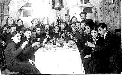 Or the cheerfully toasting Sherman family and their friends, twenty-one of them crammed together in the narrow living room around a festively set table.