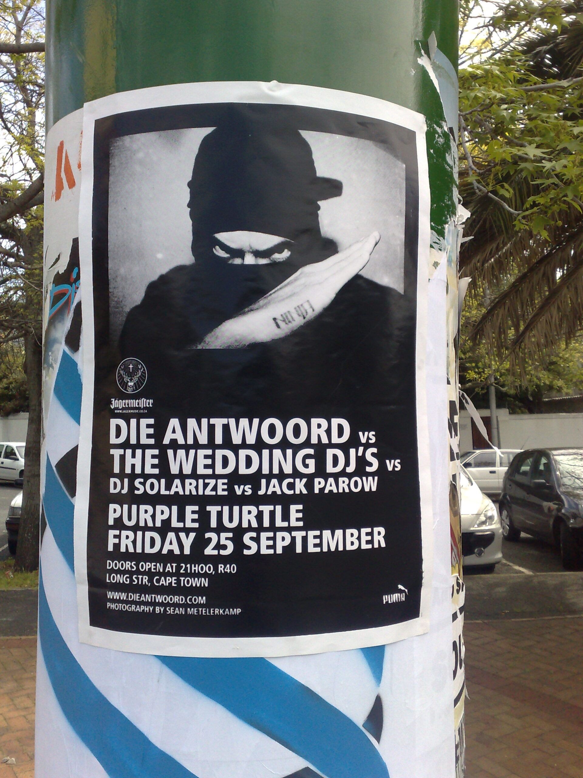 Adam Haupt points out that one of the group’s founding members, Waddy Jones, is “neither ‘coloured’ nor white Afrikaanse working class”, and continues to assert that Die Antwoord’s music amounts “to cultural appropriation given that ‘coloured’ subjects themselves have not been able to convert their cultural expressions into symbolic capital”.[26]Adam Haupt, “Part IV: Is Die Antwoord Blackface?”, Safundi 13, no. 3-4 (2012): 421, See also Adam Haupt, Static: Race and Representation in Post‑apartheid Music, Media And Film (Cape Town: HSRC Press, 2012), chap.3. He reads the music of Die Antwoord as an unambiguous performance of blackface in the group’s appropriation of coloured tropes, an instructive case of how “neo-colonial thinking on racial and gendered identities has local and global appeal” that connects in powerful ways to Web 2.0 marketing of culture.[27]Haupt, “Part IV: Is Die Antwoord Blackface?”, 422.
