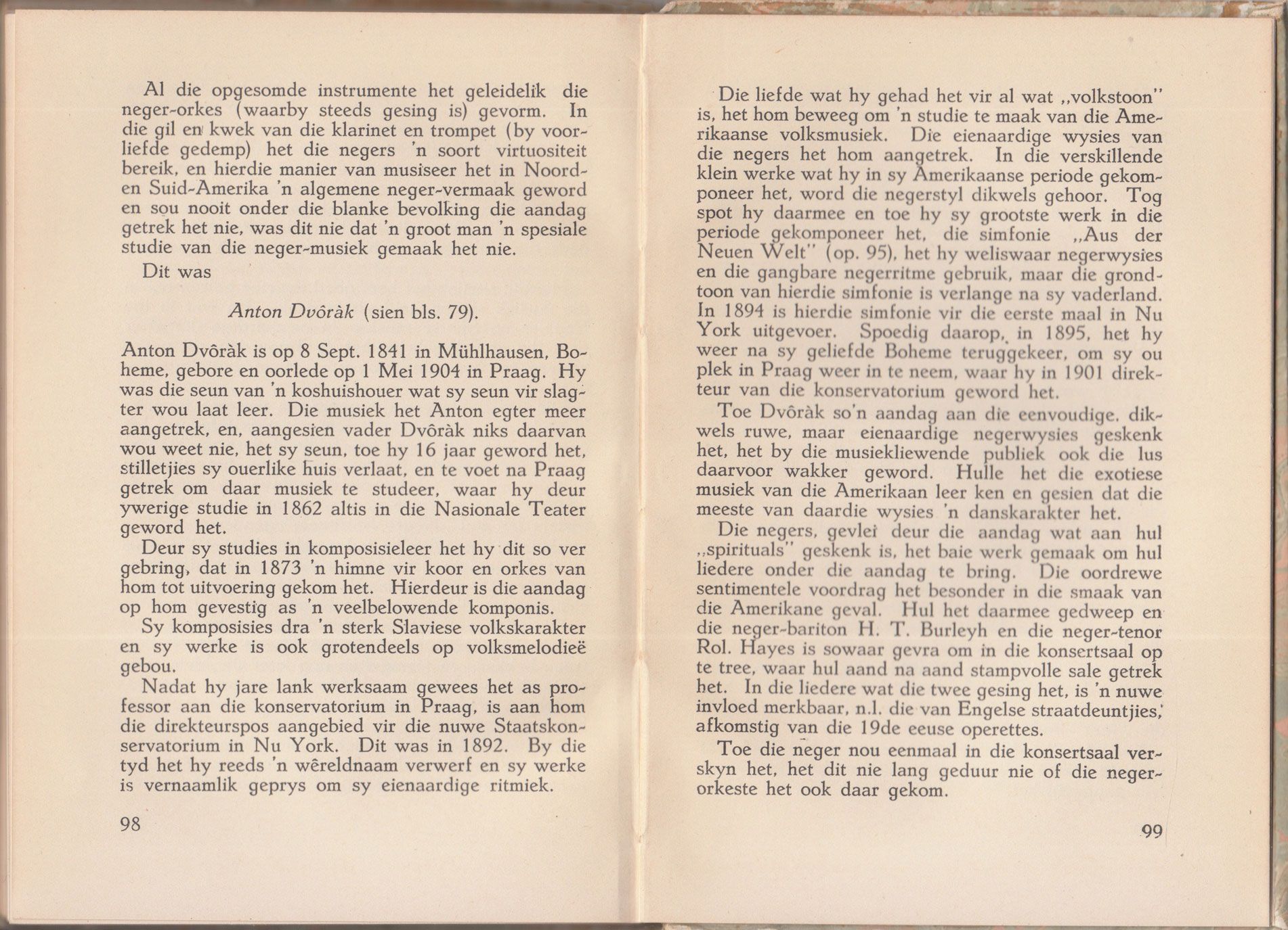 At this point, two and a half pages into his narrative on the evolution and character of jazz, Gerke makes a startling cognitive leap. He asserts that this kind of music, which had evolved into a general kind of negro amusement, would never have garnered attention amongst whites (“blankes”), were it not for the study of this music by a great (white) European, the Czech composer, Anton Dvôràk (sic). Attracted by the “strange tunes” of the negroes, Dvořák paid attention to the “simple, often rough” negro tunes and through his use thereof elicited an appetite for these tunes amongst the music-loving public. The negroes were flattered by the attention to their spirituals, and made efforts to advance the cause of this music.